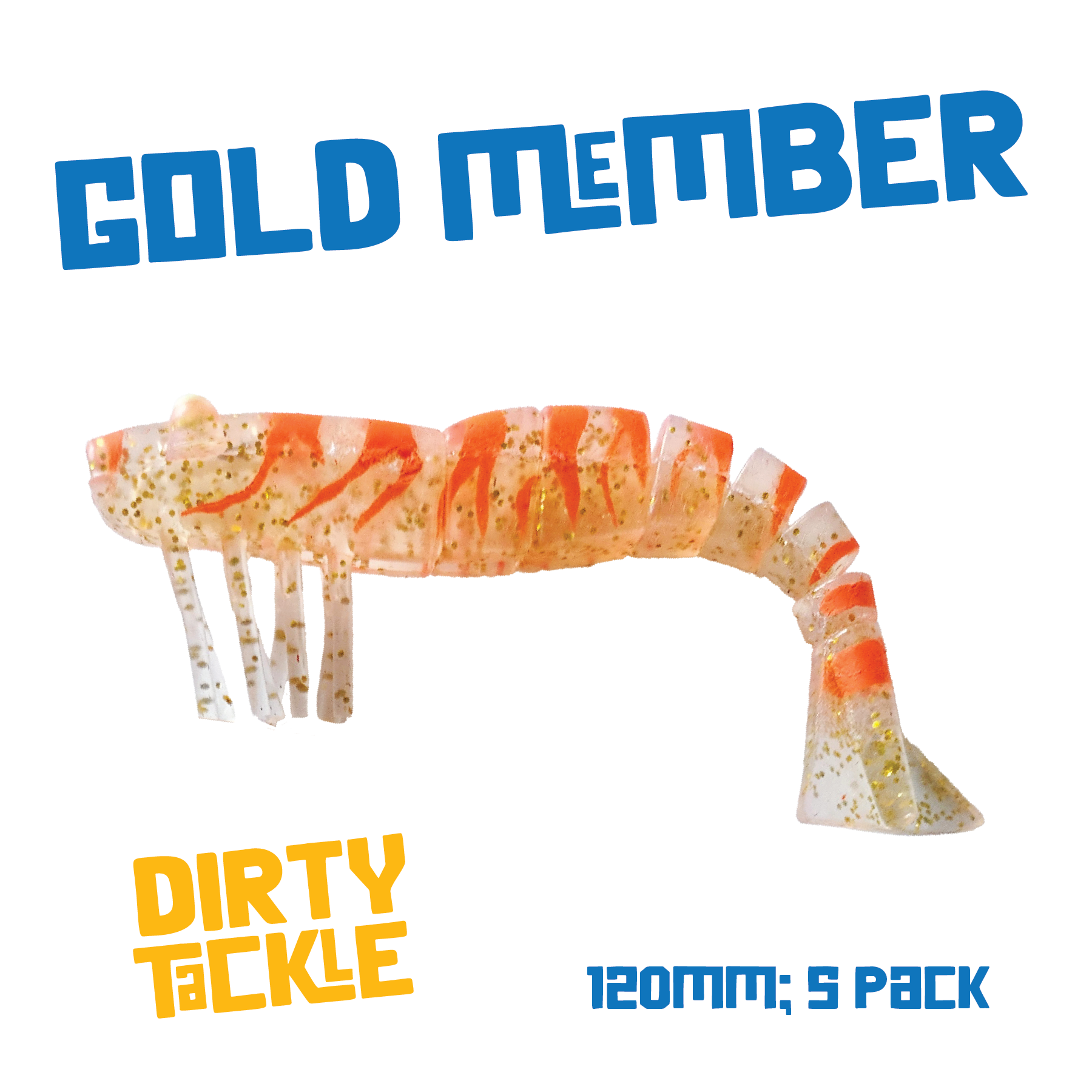 - 15 camarones de plástico blando de 120 mm/4,75" con una combinación de colores que incluye Full Commando, Red Rocket, Bareback, Gold Member y Brown Town